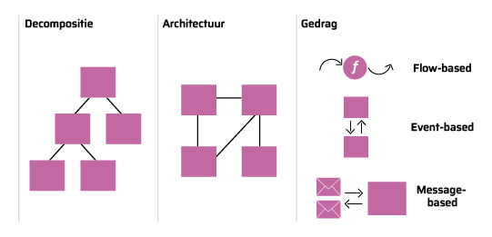 - Structuur: systemen kunnen worden gedecomponeerd in kleinere onderdelen, die interfaces hebben met elkaar.